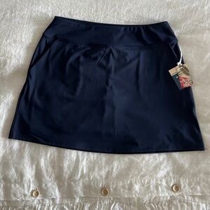 Solid Navy skort, aline style. Comfortable pull-on. Perfect for Golf, Tennis, Pickleball, or any casual/sporting activities. Two side pockets and a zip-pocket on the back right waistband.