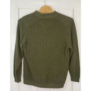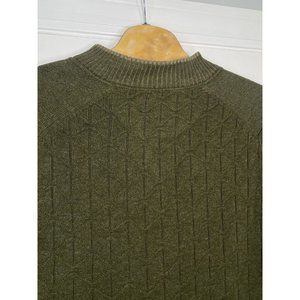 Stylish olive green sweater with a quarter zip. Features a textured pattern. Perfect for casual wear.