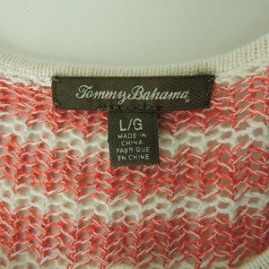 Tommy Bahama ladies long sleeve open knit tunic top. Pull over, V-neck with tie details, self rolled edges, stretchy. Color is coral red and white