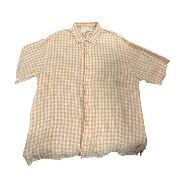 Tommy Bahama Orange Casual Button Down Shirt with Gingham Pattern 100% Linen.