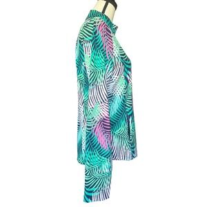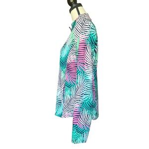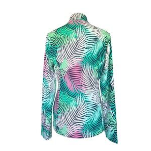 Keywords: Tommy Bahama, pullover, quarter zip, long sleeve, activewear, palm print, tropical, women's top, workout top, athletic, green, pink, resort wear, casual top, golf top, tennis top