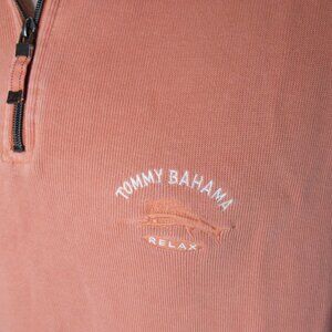 This is a Tommy Bahama peach / orange 1/2 zip aruba pullover sweatshirt jacket in men's size small.