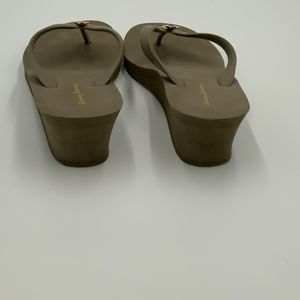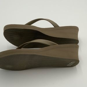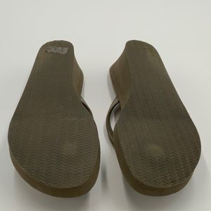 For sale is a pair of super cute Tommy Bahama wedge flip flops adorned with sparkly pineapples. They are a size 10 with an appx 2” heel. They are green/brown. Reminds me of Camo.