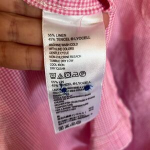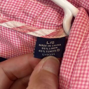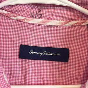 This shirt is made by Tommy Bahama. It’s a pink and white check print in a linen blend fabric. Size large and in nice pre owned condition. Smoke and pet free home.