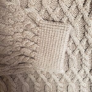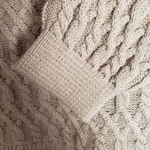 Features cable knit sweater with attached wool skirt