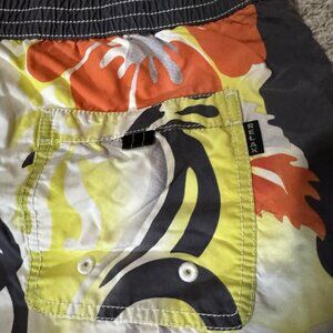 Add some tropical flair to your summer wardrobe with these Tommy Bahama Relax Swim Trunks. Featuring a bold floral print in orange, yellow, and black with signature marlin embroidery, these shorts are perfect for the beach, pool, or resort wear.
