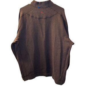Tommy Bahama reversible pullover sweater in size XL, featuring a tight-knit solid cotton fabric in orange with a brown fishing marlin theme. The sweater has long sleeves, a mock neck with a zipper, and an embroidered logo. Ideal for travel or casual wear, this breathable sweater is machine washable and suitable for winter, fall, and spring seasons. Perfect for a comfortable and stylish look while walking or engaging in outdoor activities. *** NO SIZE TAG*** Measurements are 25" pit to pit and 28" in length. Excellent condition. No rips/holes/tears/excessive stretching/stains/discoloration/snags. Kept in a smoke/pet free home.