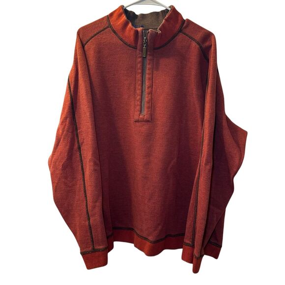 Tommy Bahama reversible pullover sweater in size XL, featuring a tight-knit solid cotton fabric in orange with a brown fishing marlin theme. The sweater has long sleeves, a mock neck with a zipper, and an embroidered logo. Ideal for travel or casual wear, this breathable sweater is machine washable and suitable for winter, fall, and spring seasons. Perfect for a comfortable and stylish look while walking or engaging in outdoor activities. *** NO SIZE TAG*** Measurements are 25" pit to pit and 28" in length. Excellent condition. No rips/holes/tears/excessive stretching/stains/discoloration/snags. Kept in a smoke/pet free home.