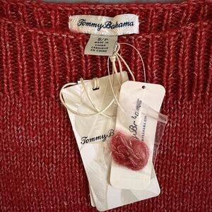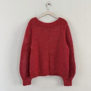 Stylish red crew neck sweater. Features intricate sleeve design. Perfect for casual wear.