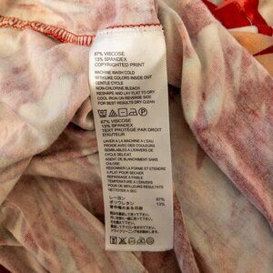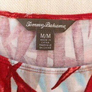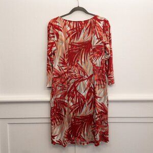 This Tommy Bahama dress features a vibrant tropical leaf print in rich red tones over a soft background of pastel hues. Made from a comfortable blend of viscose and spandex, it offers a flattering drape with just the right amount of stretch. The 3/4 length sleeves and lightweight knit make it a versatile pick for vacation, casual dining, or warm-weather events. Size Medium. Perfect for women who love effortless island style with a bold pop of color.
