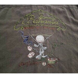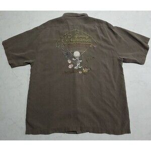 Elevate your casual style with this Tommy Bahama Relax 100% Silk Bogey & Last Call Golf Martini Tropical Camp Aloha shirt. Perfect for a beach getaway or a day out, this button-up shirt features an embroidered hibiscus relax character in brown color. The shirt is made of lightweight, breathable woven fabric with a spread collar style, short sleeves, and a relaxed fit for all-season comfort.