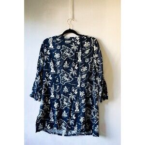 The Tommy Bahama Relax L Ocean Bliss Tunic in size 12-14 is a stylish and comfortable button-up top perfect for women who love a relaxed fit. This tunic features long sleeves and a round neckline, making it a versatile piece that can be dressed up or down. The beautiful blue color and casual sleeve design give it a laid-back yet chic look, ideal for those who want a relaxed yet fashionable wardrobe option.