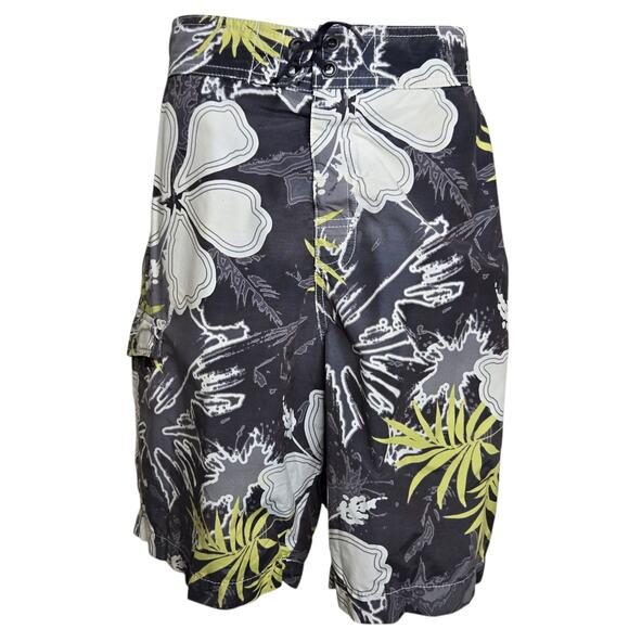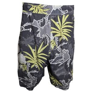 The swim trunks feature a tropical print with shades of black, gray, yellow and white.