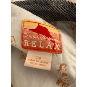 Tommy Bahama lightweight Relax Shorts Mens size 36. Colors are Blue and Gray Striped in 100% Linen. Features front slash pockets, one small pocket, two back wooden button pockets. In good used condition. Measures 36” at waist with a 10” inseam.