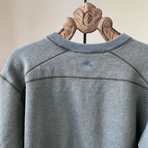 Tommy Bahama Reversible V-neck sweater featuring a washed blue side and a mineral green side with contrast stitching. The back neck on one side is embroidered with Tommy Bahama and on the other side is embroidered with their signature sailfish. There are new tags because this is a reversible sweater , so please double check measurements to ensure the proper fit for you. Laying flat measures approximately 26” shoulder to hem and 26.5” armpit to armpit