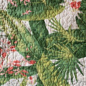 Absolutely gorgeous and in fantastic condition, this 90x90 quilt /comforter is 100% cotton. Comes with 2 Standard Shams. Quilt is comfortable to the touch and adds a tropical flair to a bedroom. Reversible! Back color is warm pink. Fits a full or queen size bed.