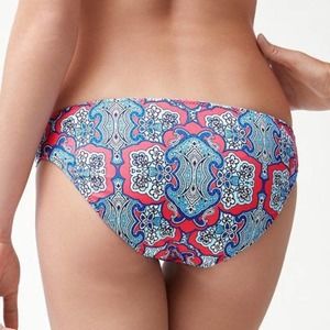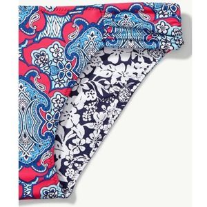 Accented with side-shirring at the hips, these reversible bikini bottoms give you twice the style with a colorful tile pattern and floral print.