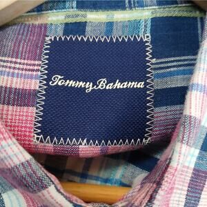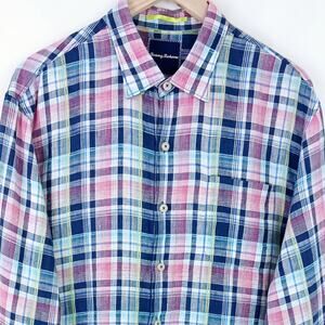 Tommy Bahama SZ L 100% Linen Romario Plaid Shirt Bering Blue $118
