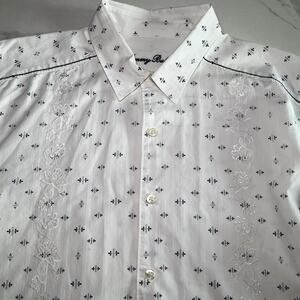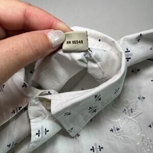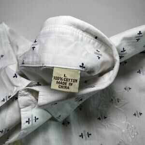 The Tommy Bahama Shirt in size L is a stylish and versatile addition to any man's wardrobe. This long sleeve button-up shirt features a geometric floral embroidered design in white and black colors, making it perfect for various occasions such as travel, weddings, parties, or casual outings. Made of breathable cotton fabric with a woven texture, this shirt is machine washable and offers a regular fit for comfortable wear. The shirt is accented with intricate button and embroidered details, giving it a unique and fashionable look that is both classic and trendy.