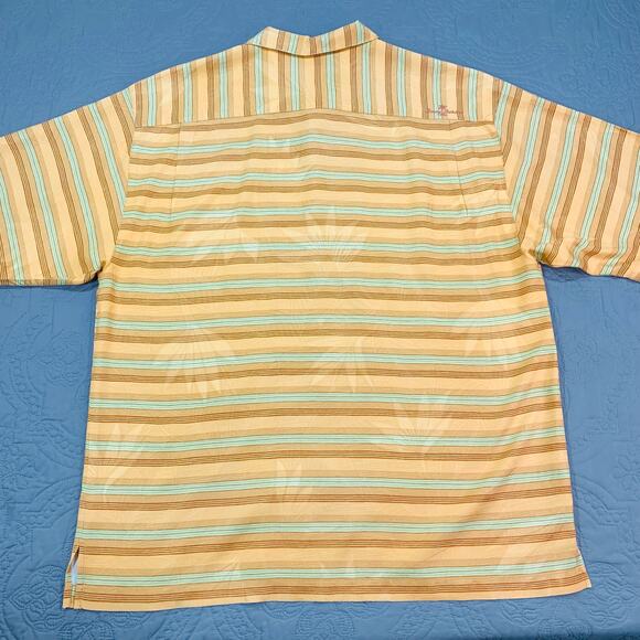 Tommy Bahama Shirt Mens Large 100% Silk Orange Striped Floral Button Hawaiian