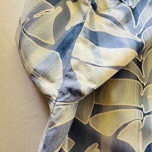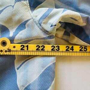 This Tommy Bahama men's large Hawaiian button-up shirt is a stylish and versatile piece perfect for various occasions. Made from 100% silk fabric, this collared shirt features a spread collar, short sleeves, and a woven floral pattern in blue and white colors. Please check your measurements to the approximate measurements provided. It comes from a pet and smoke free environment.