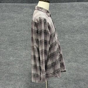 Style: Long-sleeve button-front shirt with chest pocket and spread collar; plaid pattern in gray with white and burgundy accents