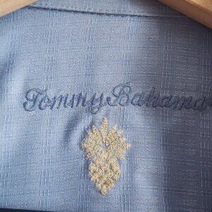 Brand: Tommy Bahama, embroidered pineapple and brand logo on inside collar, signature palm tree logo tag at hem
