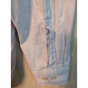 The Tommy Bahama Men's XXL Pink Blue Ombre Button Down Shirt is a stylish and casual addition to any man's wardrobe. Made from a luxurious silk blend, this shirt features a solid pattern with a multicolor ombre design that adds a pop of color and personality. The long sleeves and button-down collar give it a classic and polished look, perfect for casual occasions during the summer and spring seasons. With its regular fit and quality construction, this shirt is sure to become a versatile and favorite piece for any man's closet.