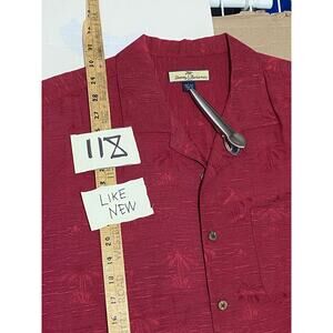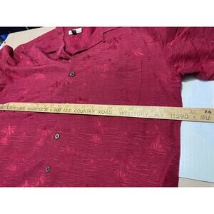 Tommy Bahama short sleeve button-up shirt in red with subtle tropical woven pattern. Soft silk fabric with chest pocket and relaxed coastal fit. Tagged Large, flat lay measurements shown. Pre-owned, excellent condition with no major flaws. Great for resort drops, vacation bundles, or upscale casual resale.