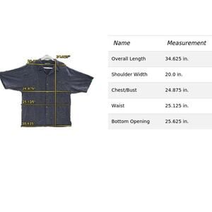 Measurements: Overall Length: 34.625" Shoulder Width: 20" Chest/Bust: 24.875" Waist: 25.125" Bottom Opening: 25.625"