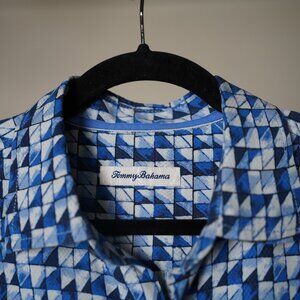 Tommy Bahama Casual Button Down, size medium. Features a blue geometric pattern. Excellent condition. Retail around $135.