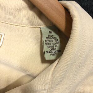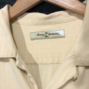 This is a Tommy Bahama men's button-up shirt made of silk, featuring an embroidery panel design with a Hawaiian theme. The shirt is of size M and is inspired by the laid-back paradise atmosphere. It is manufactured in the Bahamas, adding an authentic touch to its tropical style.