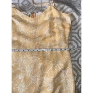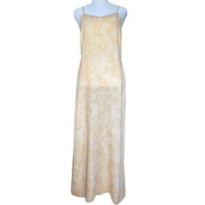 good condition vintage 90s dress the zipper is fading color relaxed, island-inspired clothing, and this dress appears to fit that aesthetic with its light color and possibly floral or nature-themed pattern. The dress is a light orange or cream color with a subtle white pattern and has thin straps. 100% silk