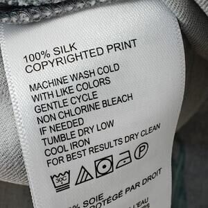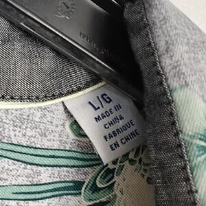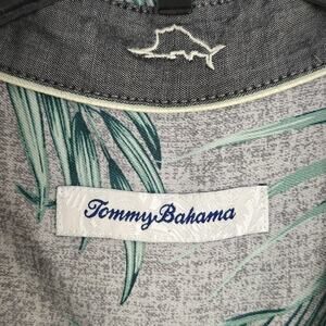 Tommy Bahama Hawaiian shirt in men's size large. Short sleeve shirt is 100% silk. Chest pocket. Pattern matches across the left and right sides of the shirt and at the pocket. Green and gray tropical print is called Goa Gardens in the colorway Bala Shark. Gently pre-owned.
