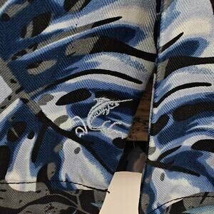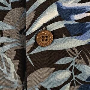 Tommy Bahama Hawaiian shirt in men's size large. Short sleeve shirt is 100% silk. Blue tropical palm leaves print. Chest pocket. Coconut buttons. Straight hem with vented side seams. Pattern matches across the left and right sides of the shirt and at the pocket. Gently pre-owned.