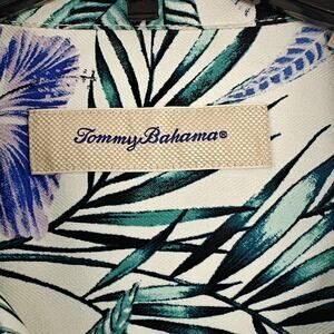 Tommy Bahama Hawaiian shirt in men's size medium. Short sleeve shirt is 100% silk. Straight hem with vented side seams. Pattern matches across the left and right sides of the shirt and at the pocket. Gently pre-owned.