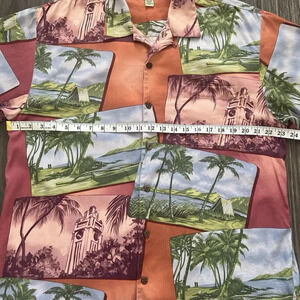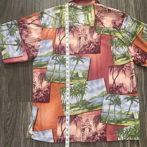 Tommy Bahama Silk Hawaiian Short Sleeve Button Down Camp Shirt Size Large Orange. Wood buttons, 100% silk.