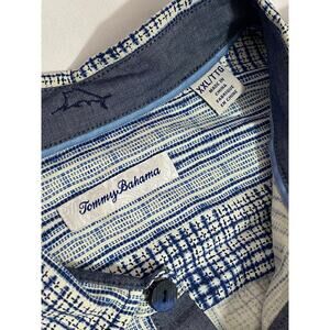 Embrace effortless island elegance with this Tommy Bahama Silk Shirt, sized Men’s 2XL. Featuring a soft blue and white textured stripe pattern, this short-sleeve button-up is crafted from 100% silk for a luxurious feel and breathable comfort. The relaxed fit and classic collar make it ideal for resort wear, beach outings, or casual evenings with a touch of sophistication.