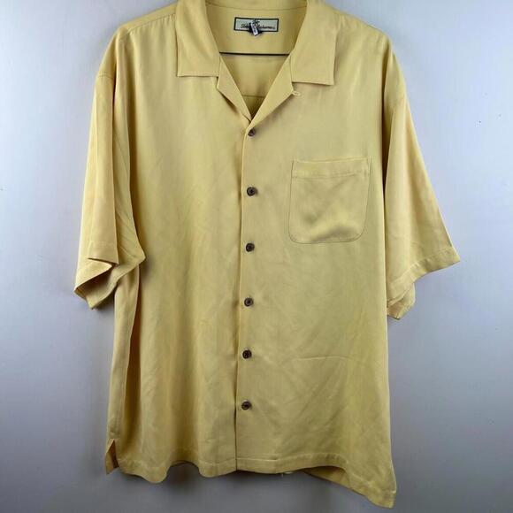 Tommy Bahama Silk Shirt Men L Yellow Camp Collar Short Sleeve Button Front