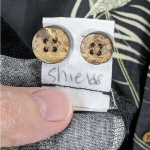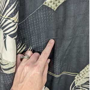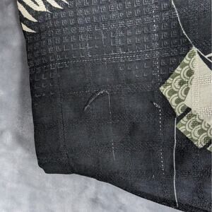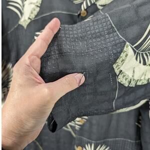 Tommy Bahama, Men's, Hawaiian, Camp, Cuban Style Shirt. Size XL. Made of 100% Silk. It is Black with Tan Leaves. Short Sleeves. There are multiple pulls and some loose threads, photographed. Washed and ready to wear. I don't see any holes or stains. See photos for measurements and details.