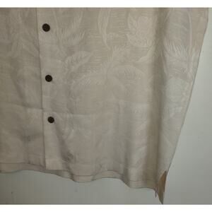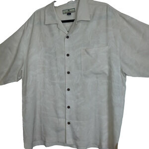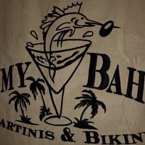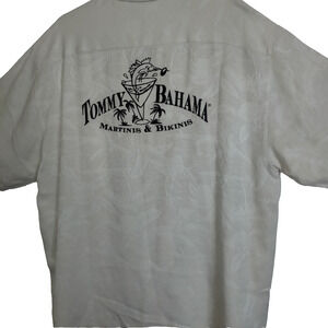 Previously Owned Tommy Bahamas Silk Short sleeved shirt. Button down. Beige with black embroidery on back that says Martinis & Bikinis. Pocket on front. Light floral print design on the fabric.