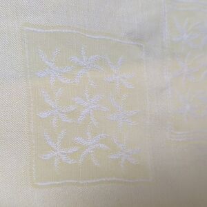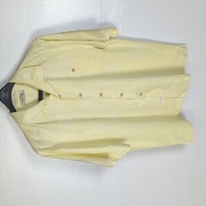 Yellow with subtle white embroidery throughout the shirt. Oxford collar. Fully button front. Single chest pocket. Excellent condition -- no stains, holes, or fraying. Laid flat pit-to-pit: 23in. Shoulder to hem: 28in.