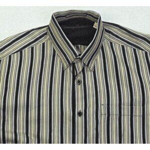 Tommy Bahama Size Medium Mens Silk Black Sage Gray Stripe Button Down Logo Shirt