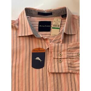 New with tags Stylish Tommy Bahama shirt to wear business casual at work then throw on some jeans for a casual look for an evening out. *there is a tiny mark in left side middle of the shirt. Likely will wash out.