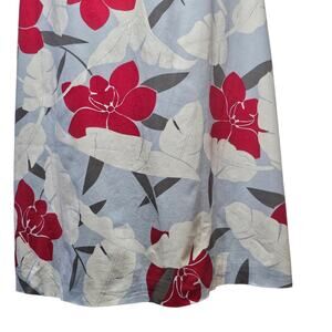 This colorful, floral, halter dress from Tommy Bahama Stretch is perfect for summer vacations! Wear alone during the day, and add a little sweater in the evening for chilly nights or to keep warm in cold air conditioning. The dress features white and red hibiscus flowers with grayish-green leaves, all on a light blue background. There are thick fabric straps that tie behind the neck, and the top of the dress is held up with a band of elastic. There is a side zipper about 12.5" long for ease of dressing. It appears the dress may have been hemmed, but the length from the top of the bust is 33". It is midi length. The Size 10 dress is in VERY GOOD PRE-OWNED CONDITION.