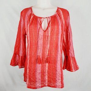 This Tommy Bahama Striped Crinkle Cotton Blouse is new with tags. It is a size Medium with a relaxed fit, 3/4 sleeves and tasseled tie front. Color is Paramour Red and it has thin gold stripes running through it. Very lightweight. 97% cotton, 2% metallic and 1% spandex.