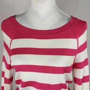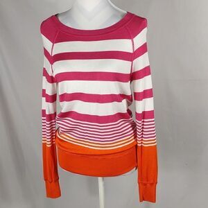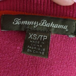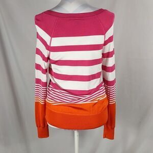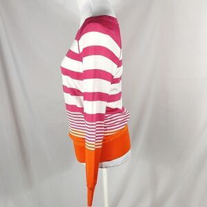 This pink, white and orange striped lightweight long sleeve Tommy Bahama sweater is a size XS with a pit to pit measuring 19". 79% viscose 17% nylon 4% spandex and hand washable. Pre-owned and in excellent condition. All offers welcome.