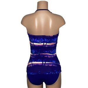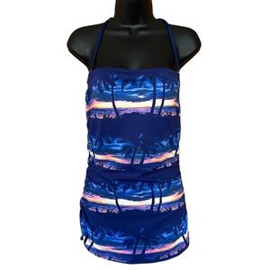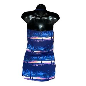 The Sunset Sky Collection features is a gorgeous pink and orange sunset print with blue palm trees and ocean background. This swimsuit is a stylish one piece swimsuit featuring a bandeau top with foam cups, tummy control, and is made from a nylon spandex blend.