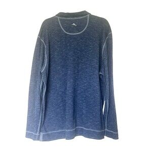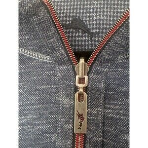 The product is a Tommy Bahama men's sweater in size medium, featuring a solid blue color and a tight-knit design. This reversible quarter-zip sweater is perfect for casual occasions, with a mock neck and long sleeves for added warmth. Made of a blend of polyester and cotton, it offers a classic and preppy style, suitable for outdoor activities like golf. The regular fit and pullover style make it a comfortable and stylish addition to any man's wardrobe.