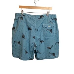 Tommy Bahama blue swim trunks with Marlin print in a size large. 2 side slit pockets, 1 back pocket and a smaller pocket in front. Velcro and tie closure, Lined. The pictures look bad for some reason, but these are in great condition, No fading, or signs of wear.